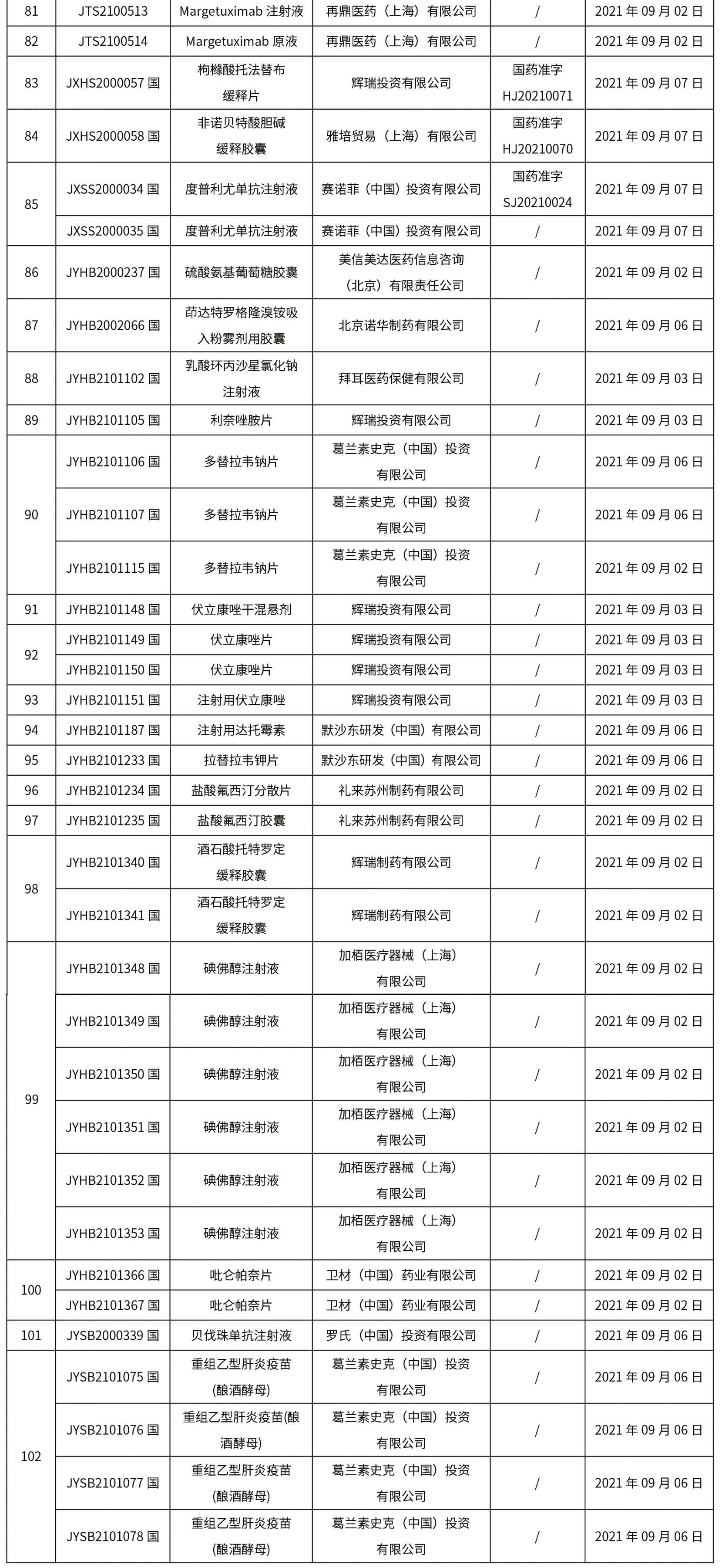 本周共計102個品種獲批取得藥品批準證明文件(本周未有特殊藥品批文),其中一致性評價品種 9個,注射劑品種5個。