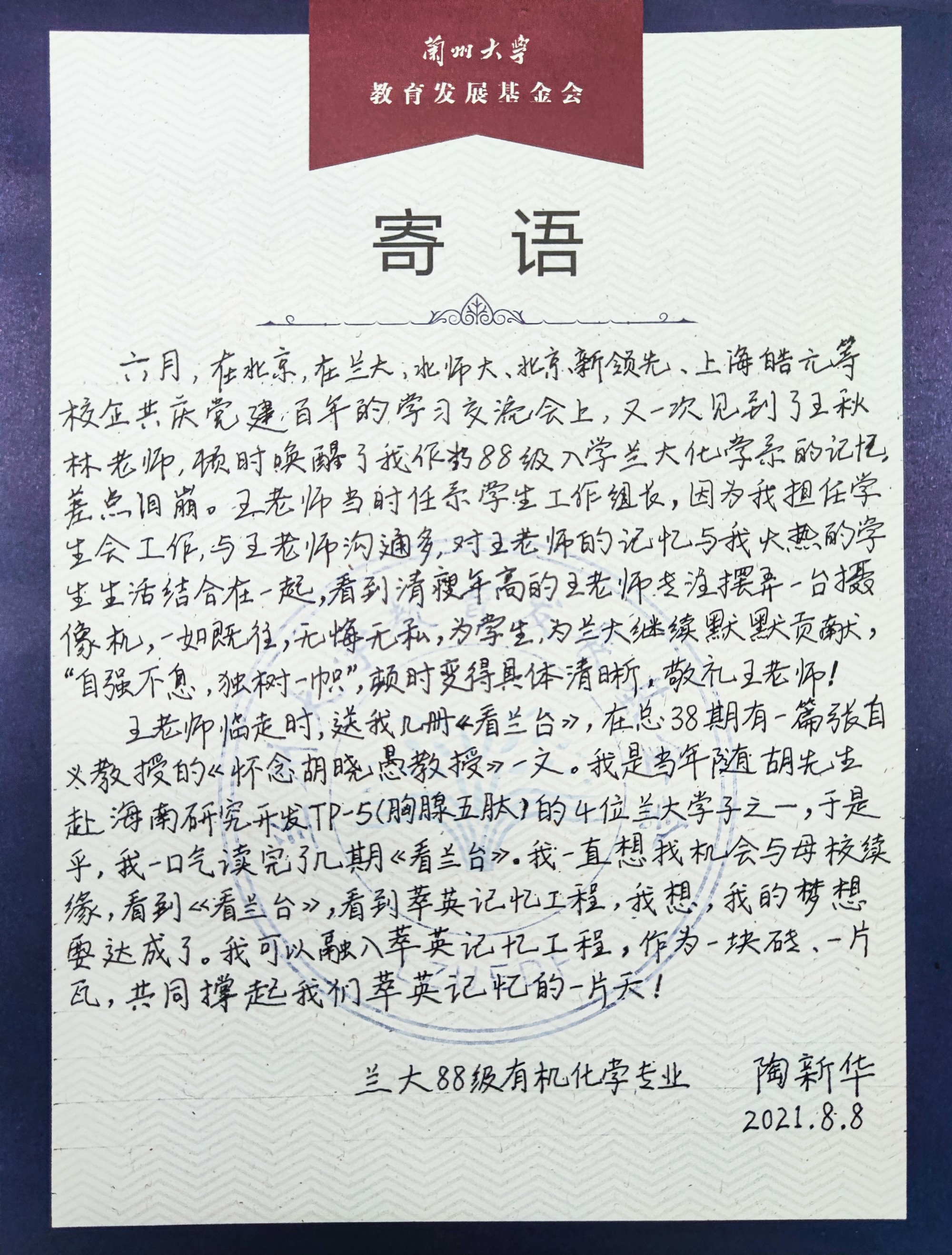 陶總談到,在蘭大求學的四年間,正是世界觀和人生觀重塑的階段,在母校“自強不息、獨樹一幟”的校風校訓的熏陶下,養(yǎng)成了獨立思考的人格和不屈的奮斗精神,在人生漫長的歲月中,無論身在何處、境遇如何,母校永遠是一個取之不盡用之不竭的力量源泉。追憶學校經(jīng)歷,陶總還特別感謝了給予他人生指引和生活幫助的老師和同學們,讓他度過了令人懷念的大學時光。飲水思源,我們深切感謝母校的培育,也密切關注母校的建設和發(fā)展,呼吁更多的蘭大學子為母校貢獻綿薄之力!