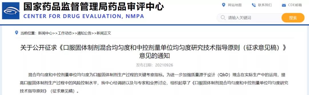 關(guān)于公開征求《口服固體制劑混合均勻度和中控劑量單位均勻度研究技術(shù)指導(dǎo)原則(征求意見稿)》意見的通知