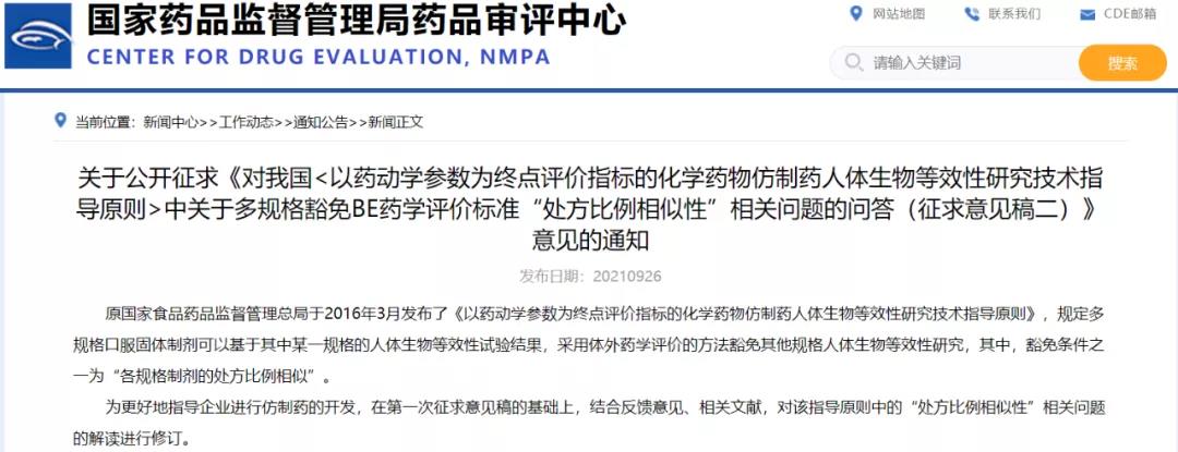 關(guān)于公開征求《對我國<以藥動學(xué)參數(shù)為終點評價指標的化學(xué)藥物仿制藥人體生物等效性研究技術(shù)指導(dǎo)原則>中關(guān)于多規(guī)格豁免BE藥學(xué)評價標準“處方比例相似性”相關(guān)問題的問答(征求意見稿二)》意見的通知