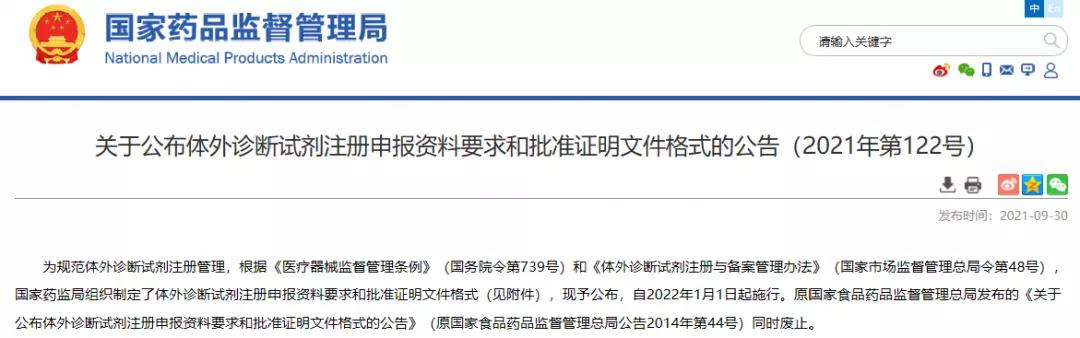 關(guān)于公布體外診斷試劑注冊申報資料要求和批準證明文件格式的公告(2021年第122號)