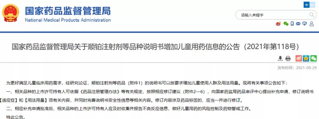 國家藥品監(jiān)督管理局關(guān)于順鉑注射劑等品種說明書增加兒童用藥信息的公告(2021年第118號)