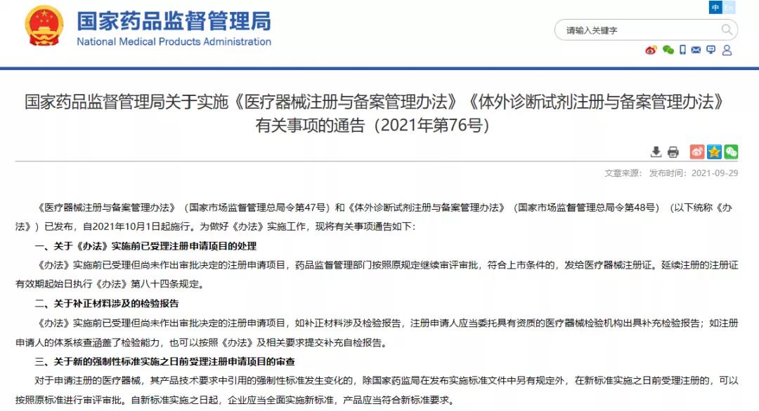 國家藥品監(jiān)督管理局關(guān)于實施《醫(yī)療器械注冊與備案管理辦法》《體外診斷試劑注冊與備案管理辦法》有關(guān)事項的通告(2021年第76號)