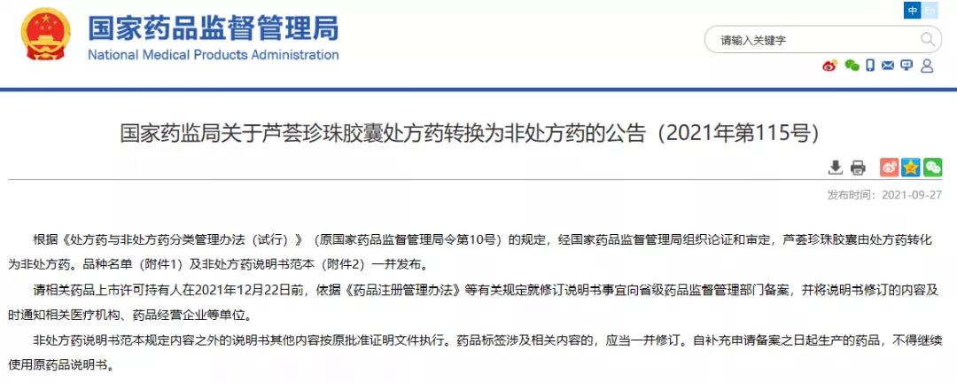 國家藥監(jiān)局關(guān)于蘆薈珍珠膠囊處方藥轉(zhuǎn)換為非處方藥的公告(2021年第115號)