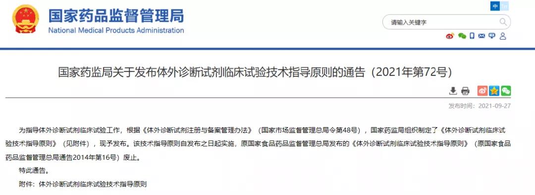 國家藥監(jiān)局關(guān)于發(fā)布體外診斷試劑臨床試驗技術(shù)指導(dǎo)原則的通告(2021年第72號)
