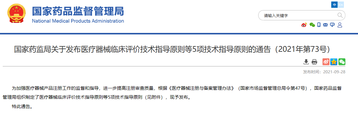 國家藥監(jiān)局關(guān)于發(fā)布醫(yī)療器械臨床評價技術(shù)指導(dǎo)原則等5項技術(shù)指導(dǎo)原則的通告(2021年第73號)