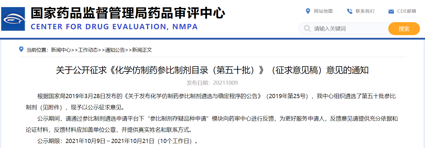 關(guān)于公開征求《化學仿制藥參比制劑目錄(第五十批)》(征求意見稿)意見的通知