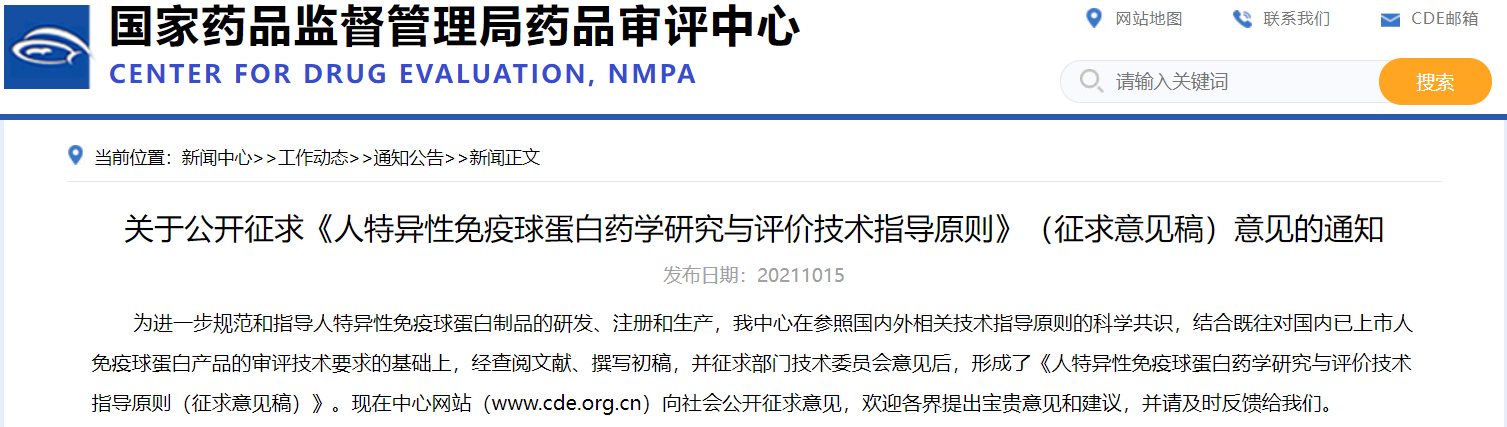 關(guān)于公開征求《人特異性免疫球蛋白藥學(xué)研究與評價技術(shù)指導(dǎo)原則》(征求意見稿)意見的通知