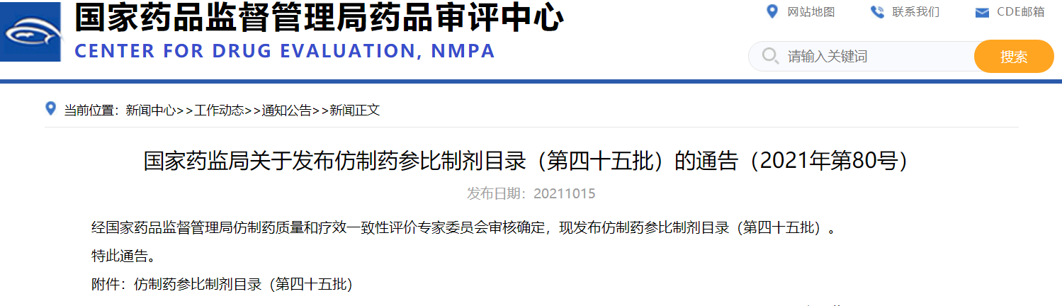 國家藥監(jiān)局關(guān)于發(fā)布仿制藥參比制劑目錄(第四十五批)的通告(2021年 第80號)