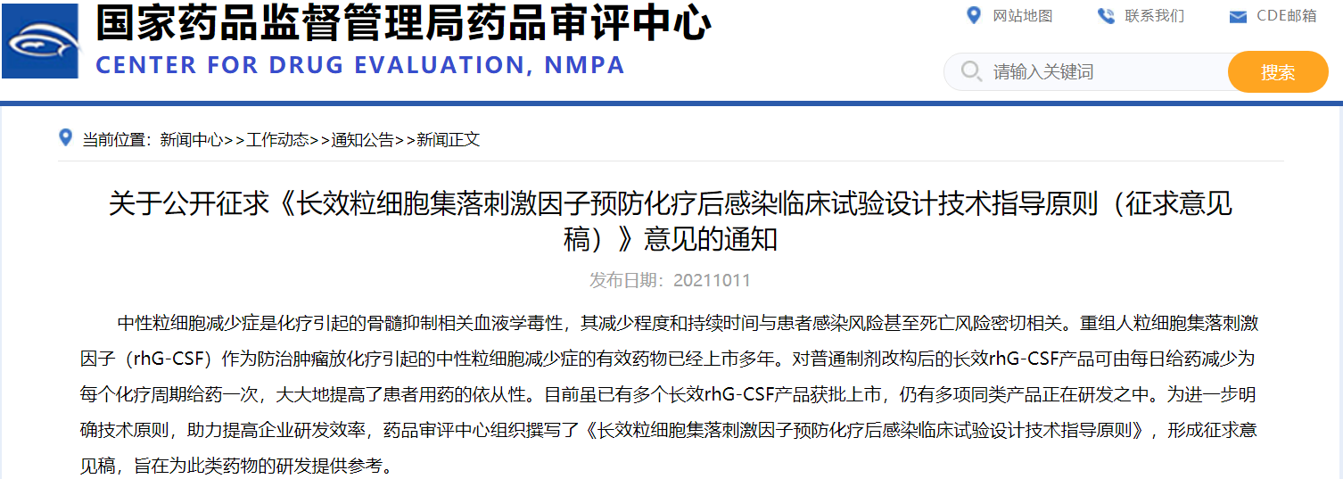 關(guān)于公開征求《長效粒細胞集落刺激因子預(yù)防化療后感染臨床試驗設(shè)計技術(shù)指導(dǎo)原則(征求意見稿)》意見的通知