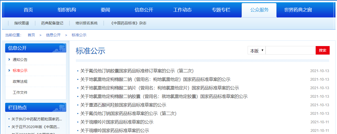 本周氟伐他汀鈉膠囊國家藥品標準修訂草案的公示(第二次),地氯雷他定枸櫞酸二鈉(曾用名:枸地氯雷他定)、地氯雷他定枸櫞酸二鈉片(曾用名:枸地氯雷他定片)、地氯雷他定枸櫞酸二鈉膠囊(曾用名:就地氯雷他定膠囊)、重酒石酸間羥胺、氟伐他汀鈉、巰嘌呤片、巰嘌呤國家藥品標準草案公示。