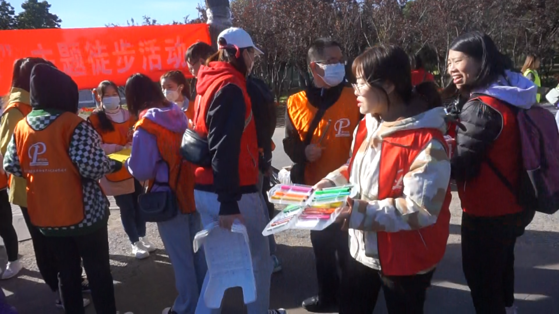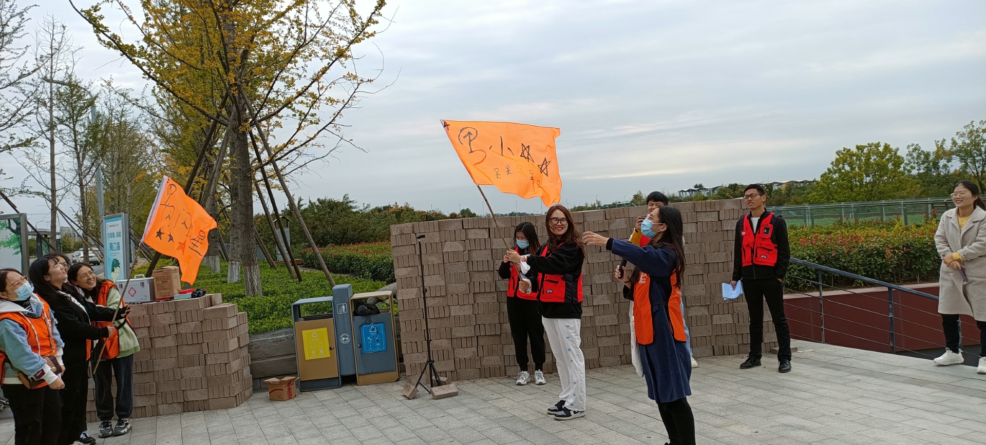 ▲各隊隊員高舉隊旗,耳聽秋風(fēng),腳踩落葉,有說有笑,相伴同行