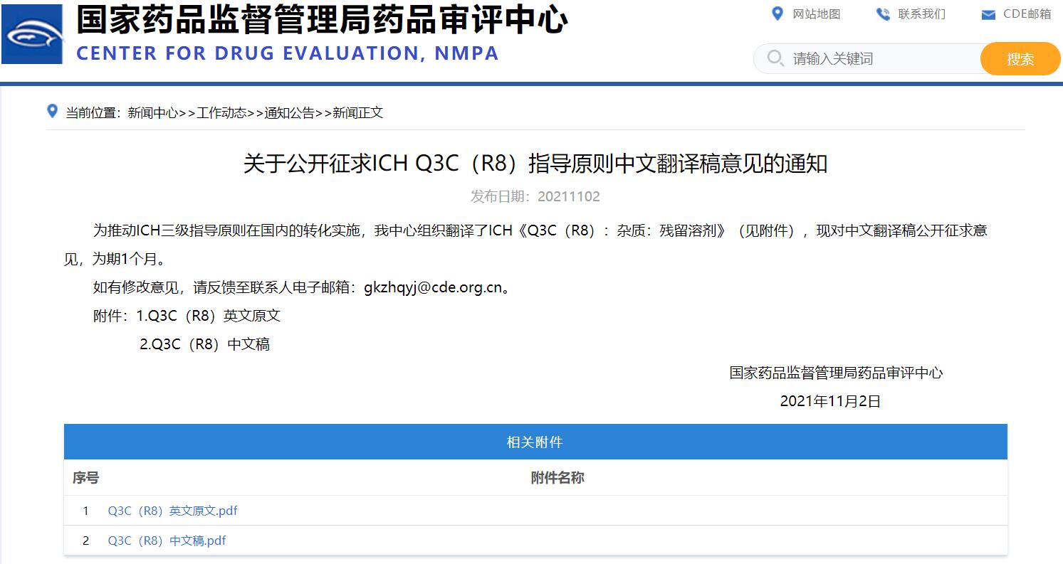 關(guān)于公開(kāi)征求ICH Q3C(R8)指導(dǎo)原則中文翻譯稿意見(jiàn)的通知