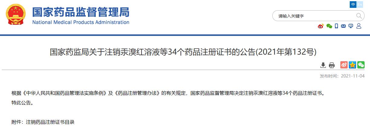 國(guó)家藥監(jiān)局關(guān)于注銷汞溴紅溶液等34個(gè)藥品注冊(cè)證書(shū)的公告(2021年第132號(hào))