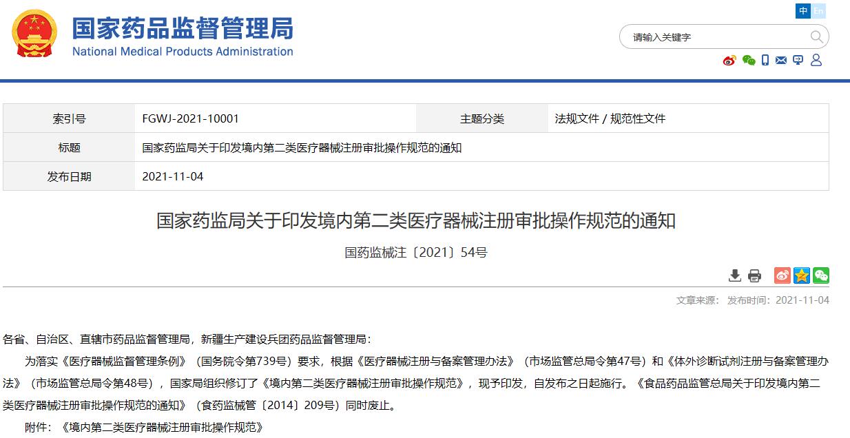 國(guó)家藥監(jiān)局關(guān)于印發(fā)境內(nèi)第二類醫(yī)療器械注冊(cè)審批操作規(guī)范的通知