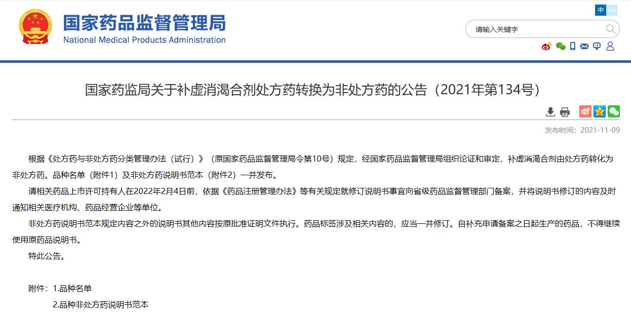 國(guó)家藥監(jiān)局關(guān)于補(bǔ)虛消渴合劑處方藥轉(zhuǎn)換為非處方藥的公告(2021年第134號(hào))
