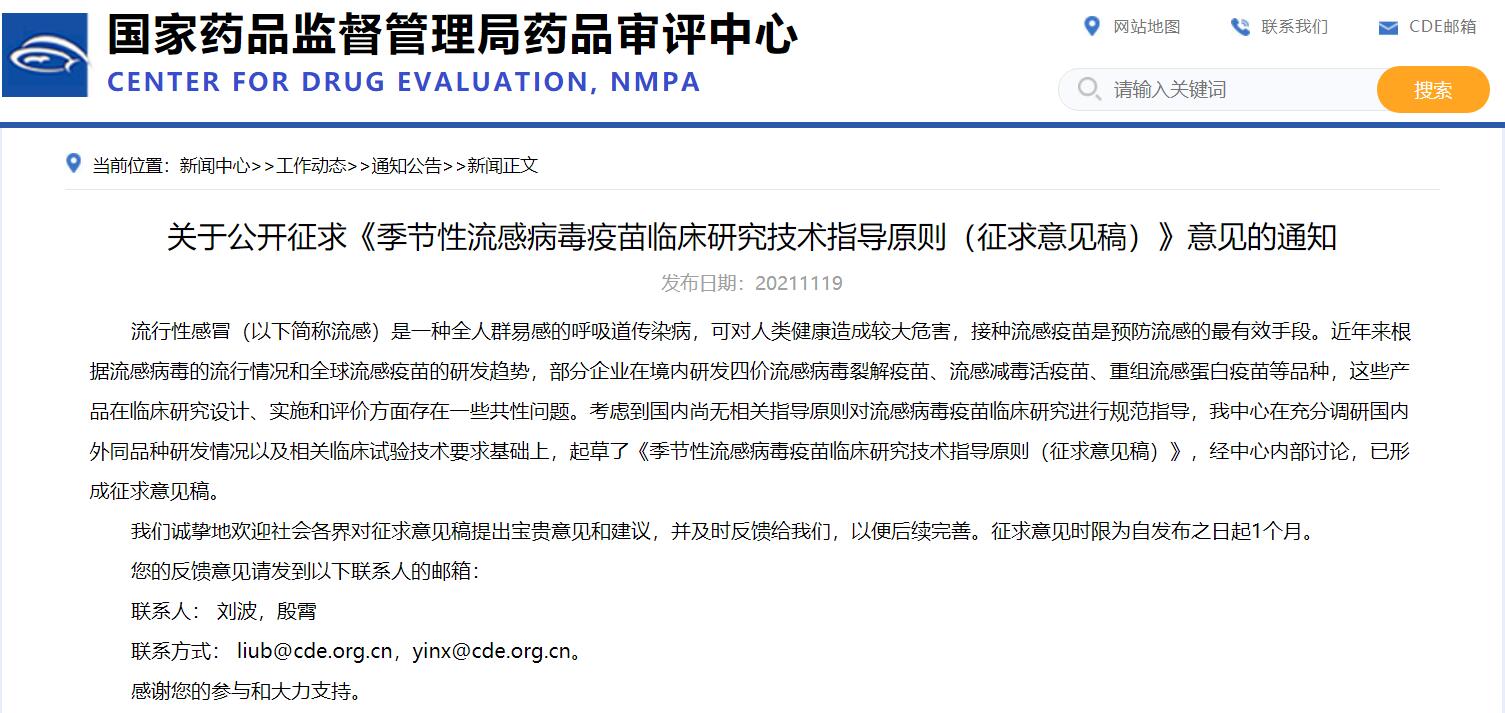 關(guān)于公開征求《季節(jié)性流感病毒疫苗臨床研究技術(shù)指導(dǎo)原則(征求意見稿)》意見的通知