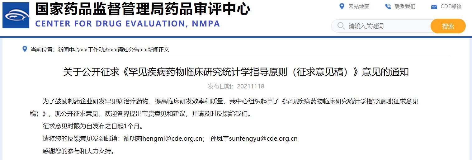 關(guān)于公開征求《罕見疾病藥物臨床研究統(tǒng)計學(xué)指導(dǎo)原則(征求意見稿)》意見的通知
