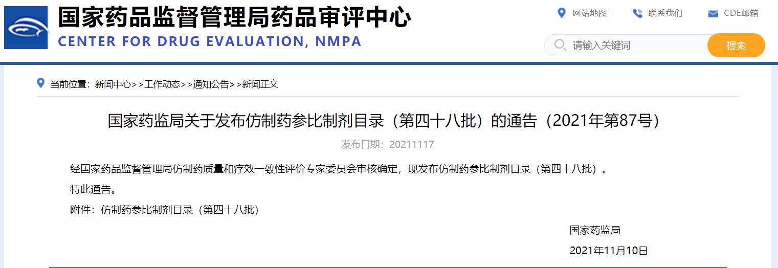 國家藥監(jiān)局關(guān)于發(fā)布仿制藥參比制劑目錄(第四十八批)的通告(2021年第87號)