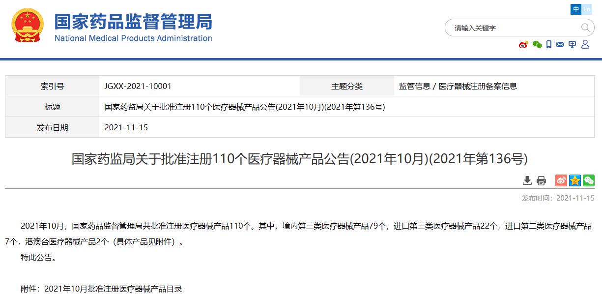 國家藥監(jiān)局關(guān)于批準(zhǔn)注冊110個醫(yī)療器械產(chǎn)品公告(2021年10月)(2021年第136號)