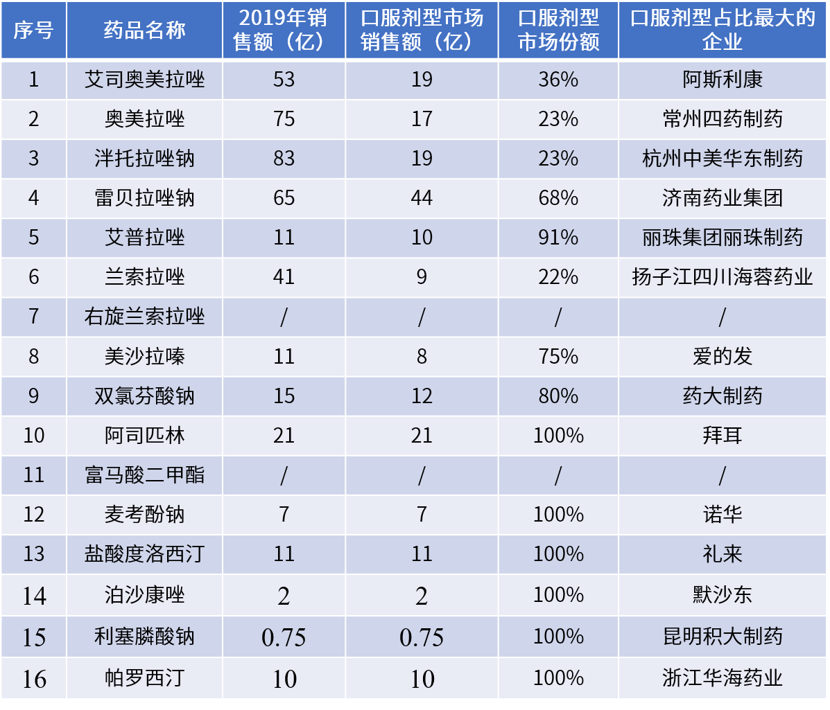 腸溶制劑憑借其獨特的臨床優(yōu)勢,誕生了數(shù)個重磅產(chǎn)品,如質(zhì)子泵抑制劑類,心血管疾病一線治療藥物阿司匹林腸溶片,新型抗真菌藥物泊沙康唑腸溶片和腸溶干混懸劑以及抑郁市場主力產(chǎn)品度洛西汀腸溶膠囊等。