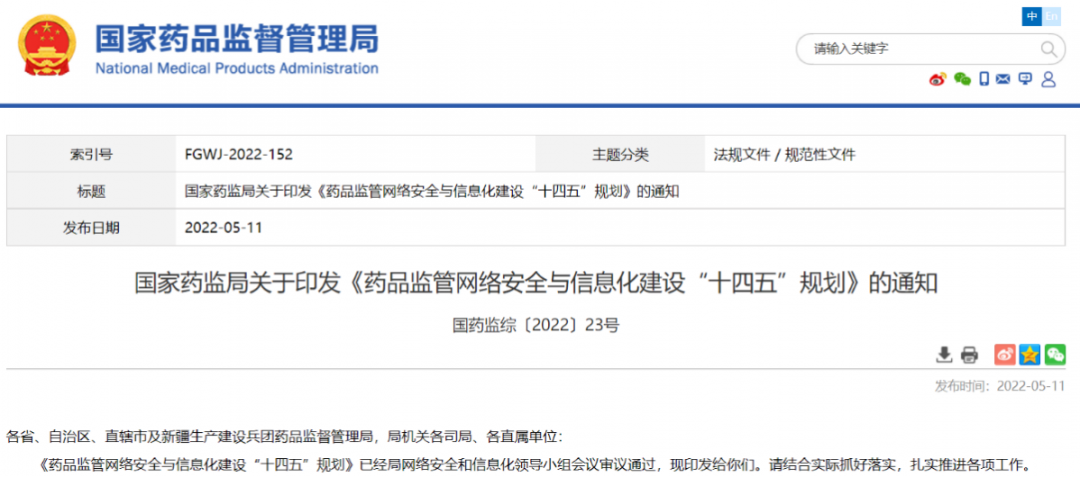 國家藥監(jiān)局關(guān)于印發(fā)《藥品監(jiān)管網(wǎng)絡安全與信息化建設(shè)“十四五”規(guī)劃》的通知