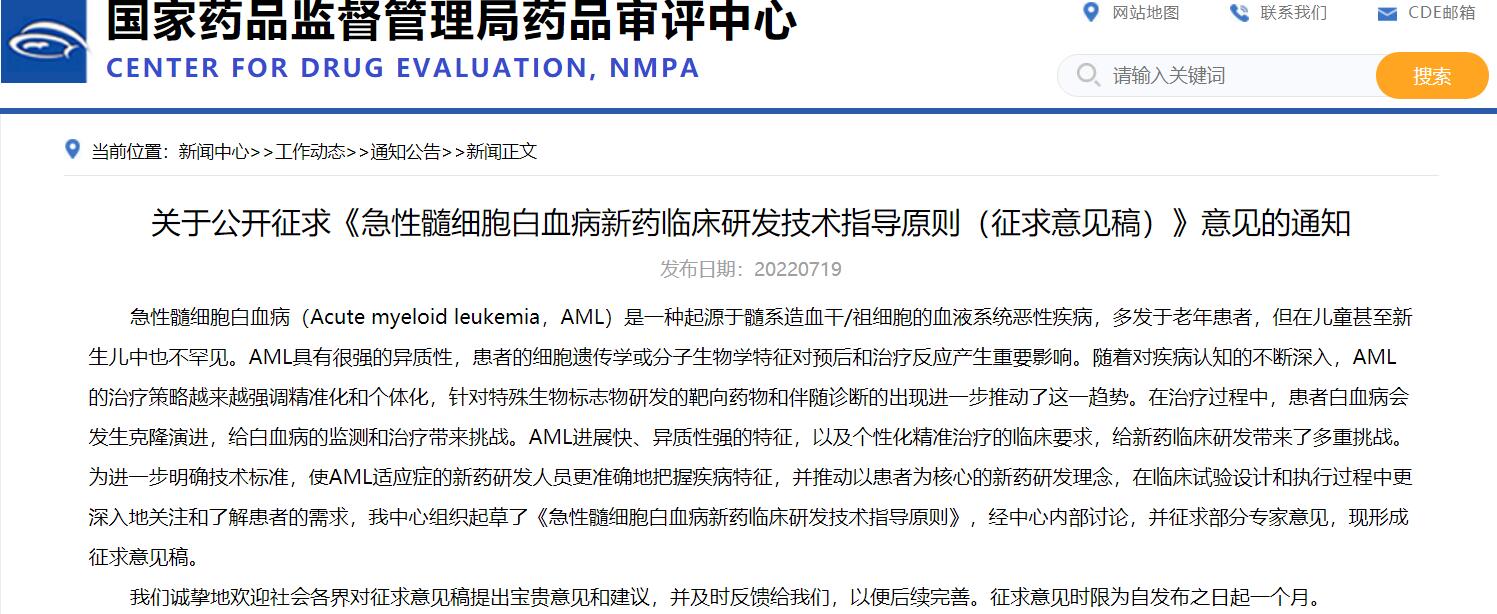 關于公開征求《急性髓細胞白血病新藥臨床研發(fā)技術指導原則(征求意見稿)》意見的通知