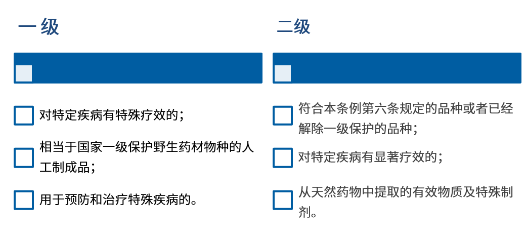 根據(jù)《中藥品種保護條例》,國家對受保護的中藥品種劃分一級和二級。中藥一級保護品種分別為三十年、二十年、十年;中藥二級保護品種為七年。