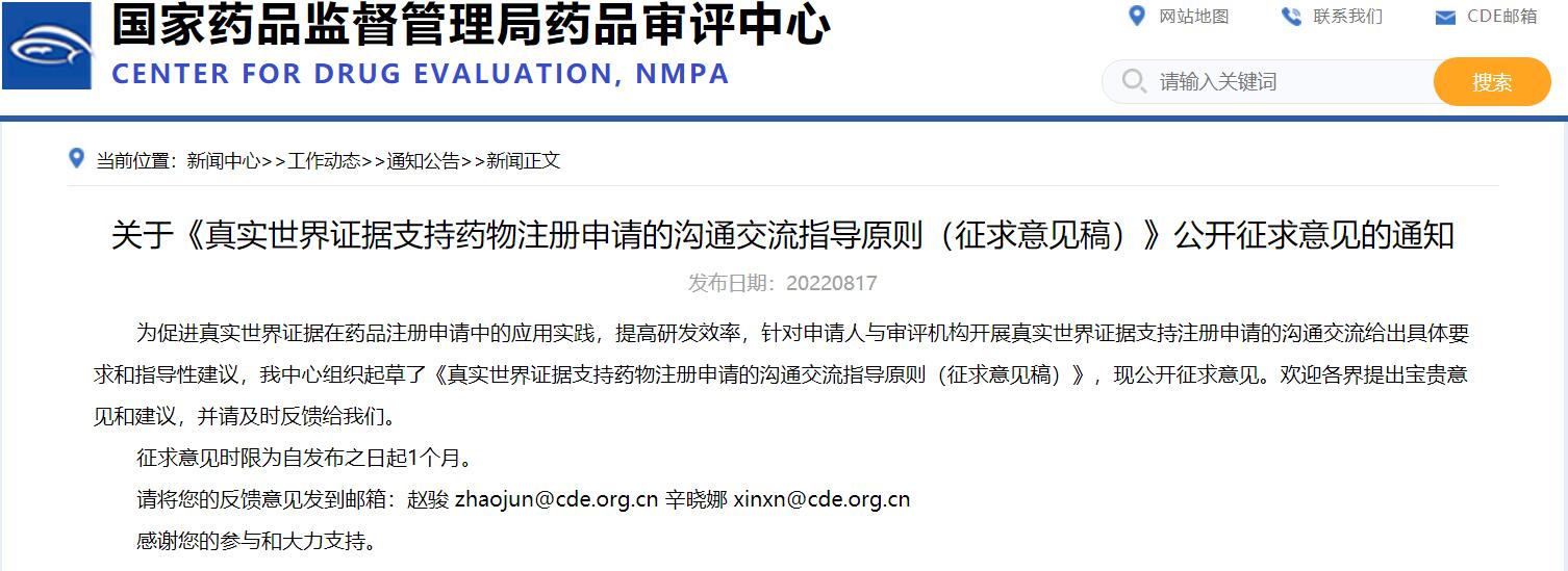 關(guān)于《真實世界證據(jù)支持藥物注冊申請的溝通交流指導(dǎo)原則(征求意見稿)》公開征求意見的通知