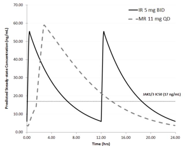 ·多劑量研究中(連續(xù)服用5天),托法替布緩釋片11mg(qd)與托法替布片5mg(bid),開展BE試驗(yàn)。