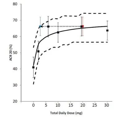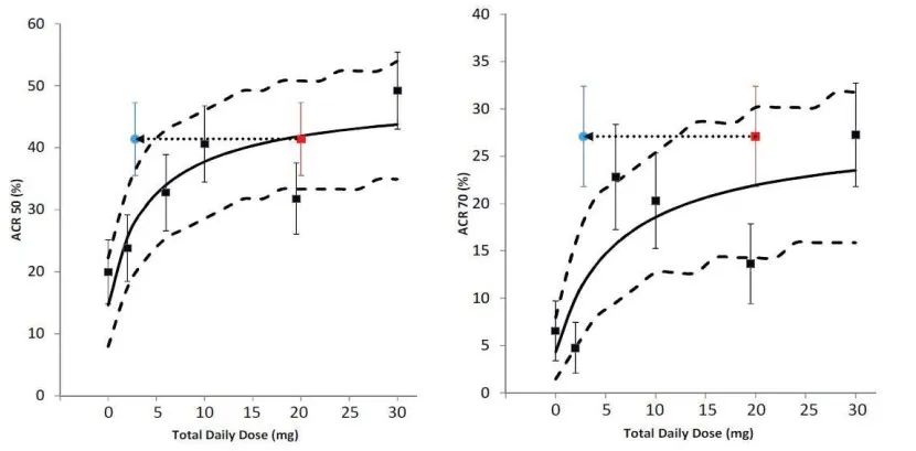 上述結(jié)果,美國風(fēng)濕協(xié)會(huì)認(rèn)為20mg(qd)和10mg(bid)的療效一致。而兩者的PK參數(shù)中Cmin值降低7倍(約為86%),該值遠(yuǎn)遠(yuǎn)大于緩釋制劑11mg(qd)和速釋制劑5mg(bid)的差異(降低約29%)。因此緩釋制劑和速釋制劑雖Cmin和Ctrough值有差異,但并不影響的藥效,兩種制劑的藥效一致。