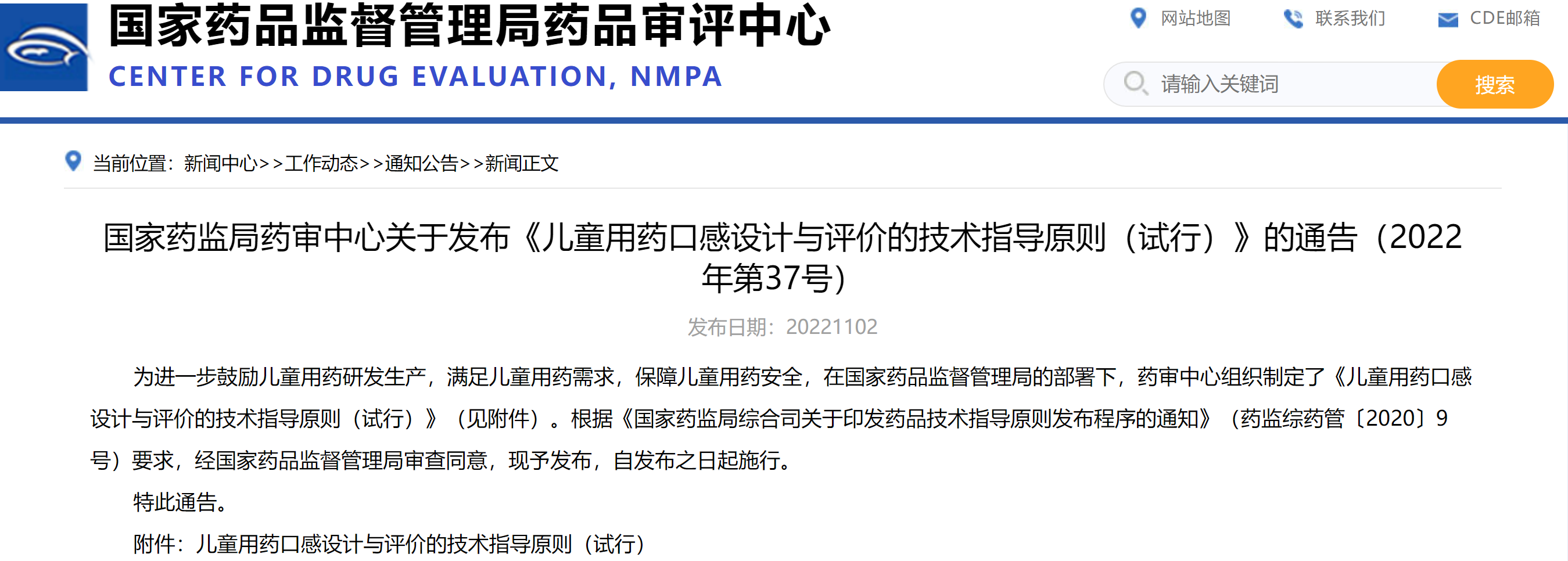 國(guó)家藥監(jiān)局藥審中心關(guān)于發(fā)布《兒童用藥口感設(shè)計(jì)與評(píng)價(jià)的技術(shù)指導(dǎo)原則(試行)》的通告(2022年第37號(hào))