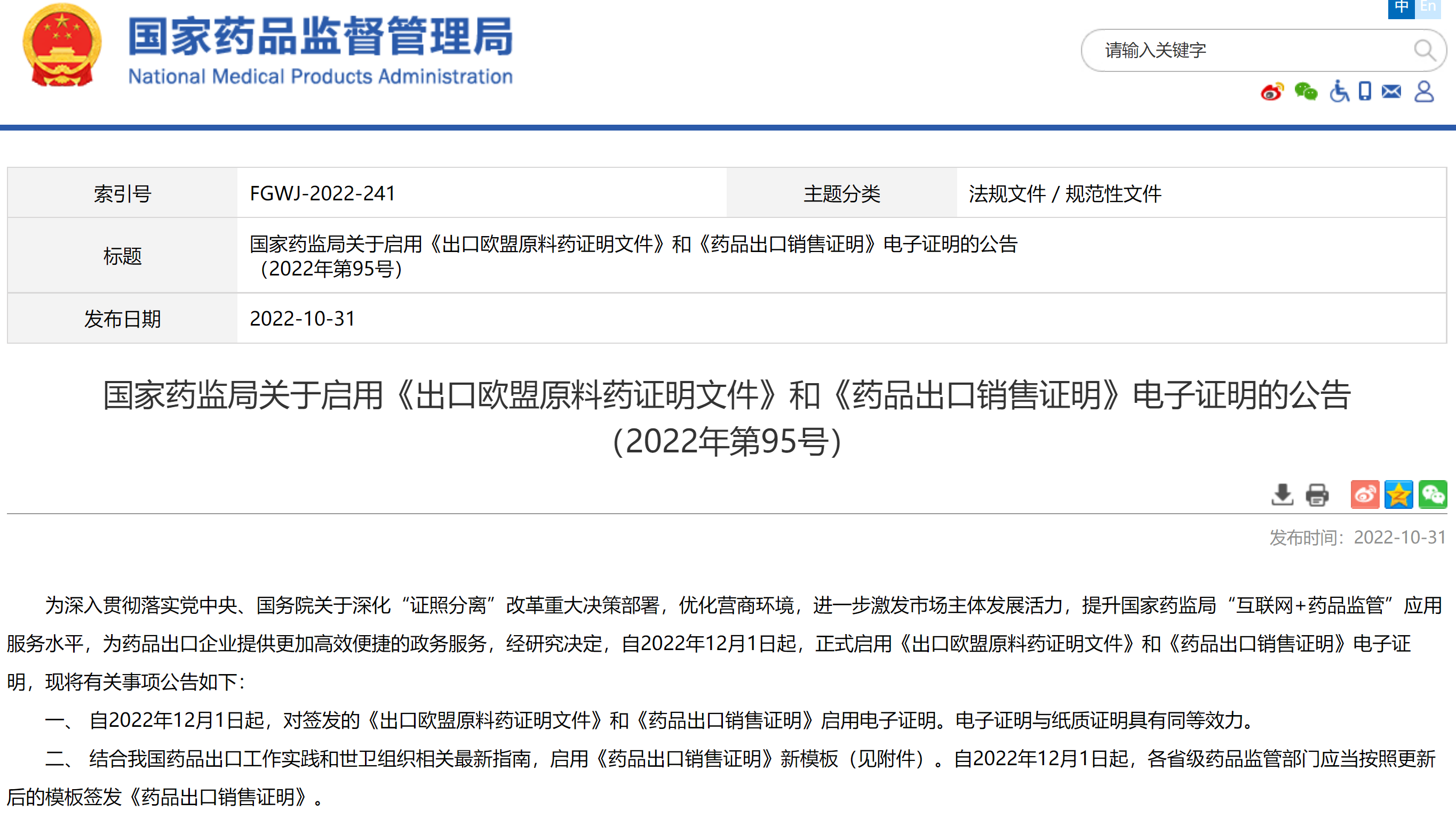 國(guó)家藥監(jiān)局關(guān)于啟用《出口歐盟原料藥證明文件》和《藥品出口銷售證明》電子證明的公告(2022年第95號(hào))