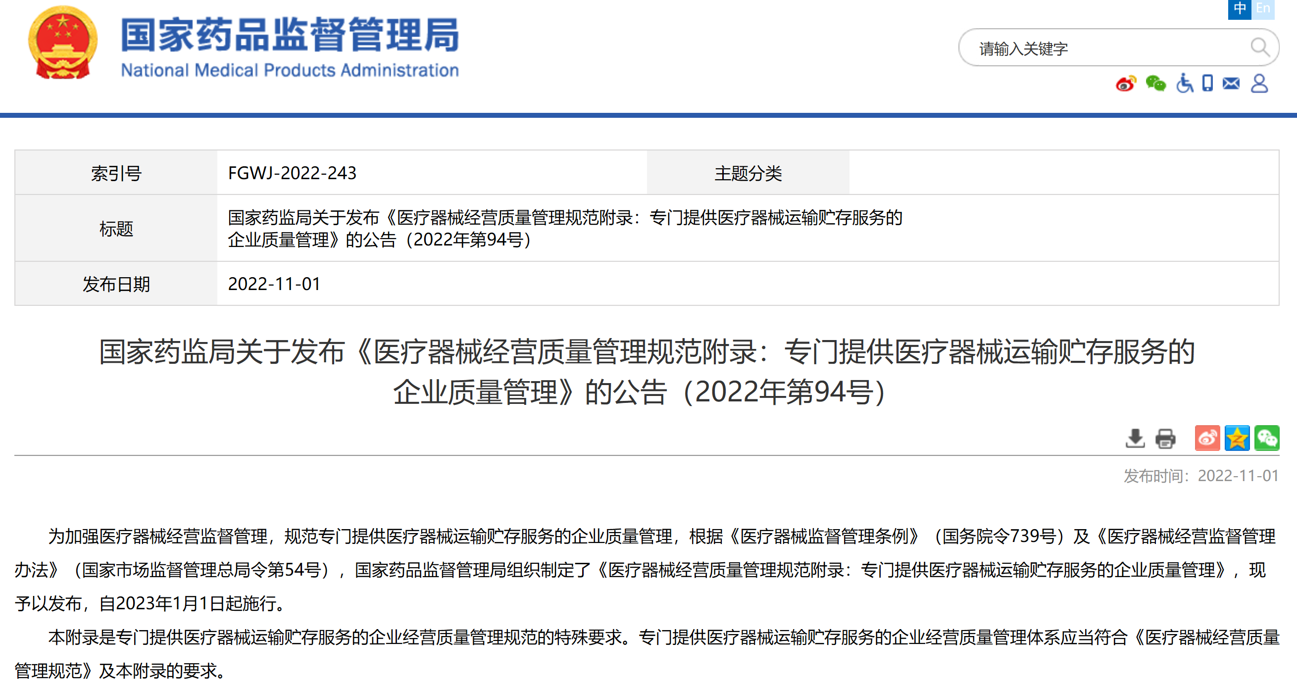 國(guó)家藥監(jiān)局關(guān)于發(fā)布《醫(yī)療器械經(jīng)營(yíng)質(zhì)量管理規(guī)范附錄:專門提供醫(yī)療器械運(yùn)輸貯存服務(wù)的企業(yè)質(zhì)量管理》的公告(2022年第94號(hào))