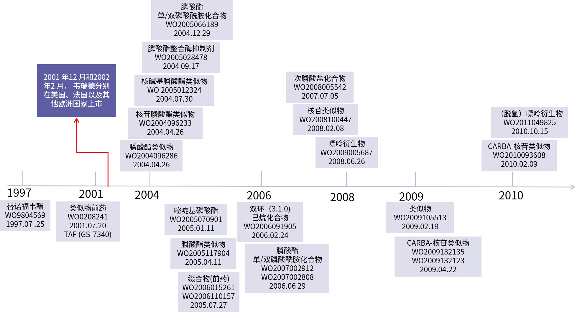 首先,以時(shí)間為導(dǎo)向,縱向分析原研公司對(duì)替諾福韋酯的專利的布局,見(jiàn)下圖。