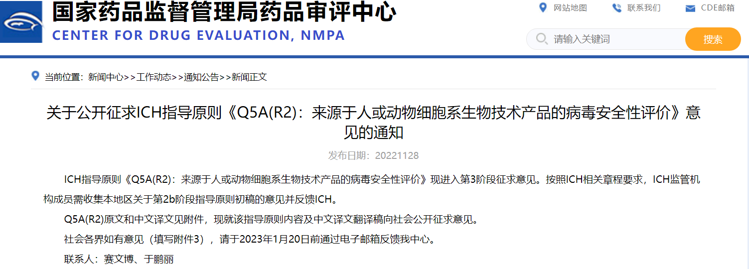 關(guān)于公開征求ICH指導(dǎo)原則《Q5A(R2):來源于人或動物細(xì)胞系生物技術(shù)產(chǎn)品的病毒安全性評價》意見的通知