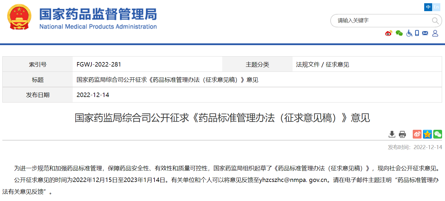 國家藥監(jiān)局綜合司公開征求《藥品標準管理辦法(征求意見稿)》意見