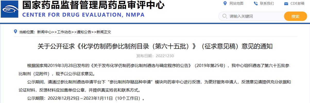 關(guān)于公開征求《化學(xué)仿制藥參比制劑目錄(第六十五批)》(征求意見稿)意見的通知