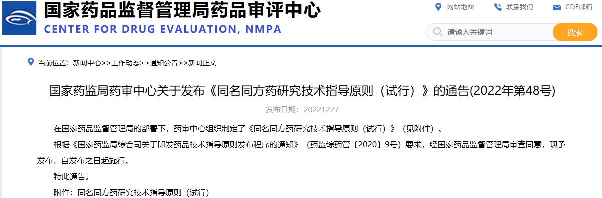 國家藥監(jiān)局藥審中心關(guān)于發(fā)布《同名同方藥研究技術(shù)指導(dǎo)原則(試行)》的通告(2022年第48號)