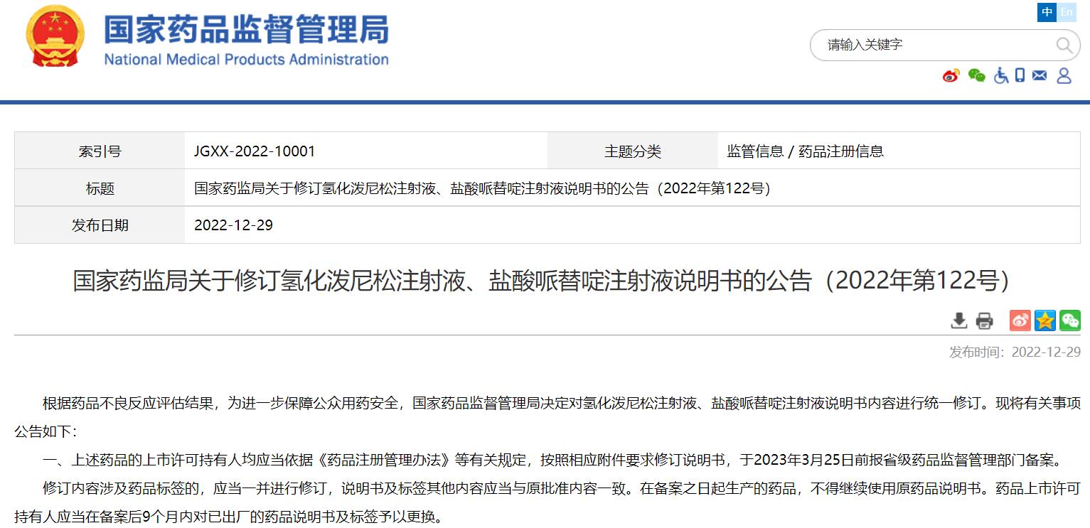 國家藥監(jiān)局關(guān)于修訂氫化潑尼松注射液、鹽酸哌替啶注射液說明書的公告(2022年第122號)
