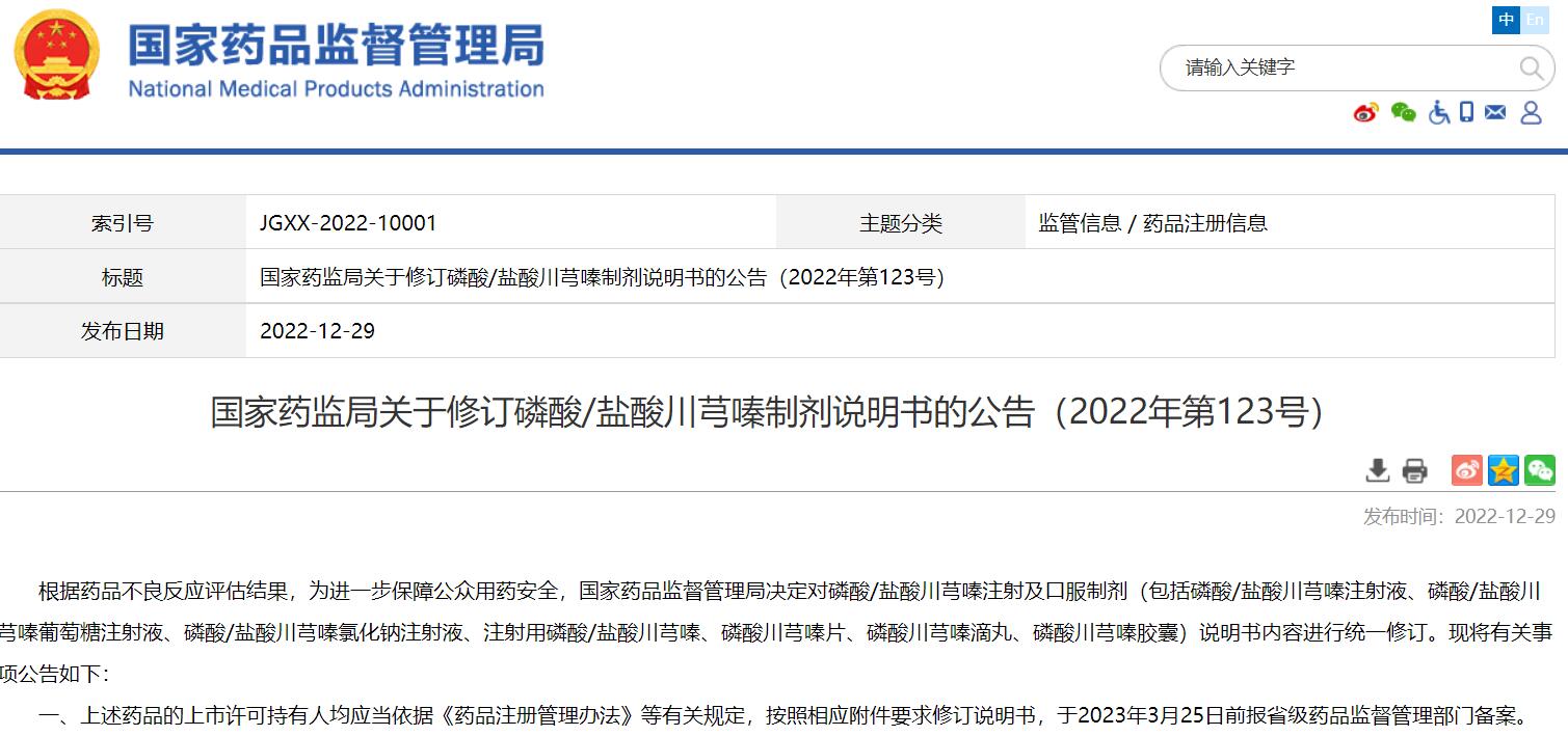 國家藥監(jiān)局關(guān)于修訂磷酸/鹽酸川芎嗪制劑說明書的公告(2022年第123號)