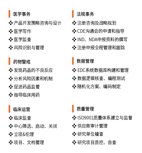 旗下?lián)碛?00余人的專業(yè)臨床服務(wù)團(tuán)隊(duì),下設(shè)醫(yī)學(xué)部、臨床運(yùn)營部、數(shù)據(jù)部、藥物警戒部、質(zhì)量控制委員會、藥政部、項(xiàng)目管理部、上會管理中心等部門,項(xiàng)目全面覆蓋生物藥、化藥、中藥、醫(yī)療器械、細(xì)胞與基因治療等藥物、滿足不同研發(fā)型企業(yè)的臨床研究定制需求,為國內(nèi)外客戶打通新藥上市前關(guān)鍵瓶頸。