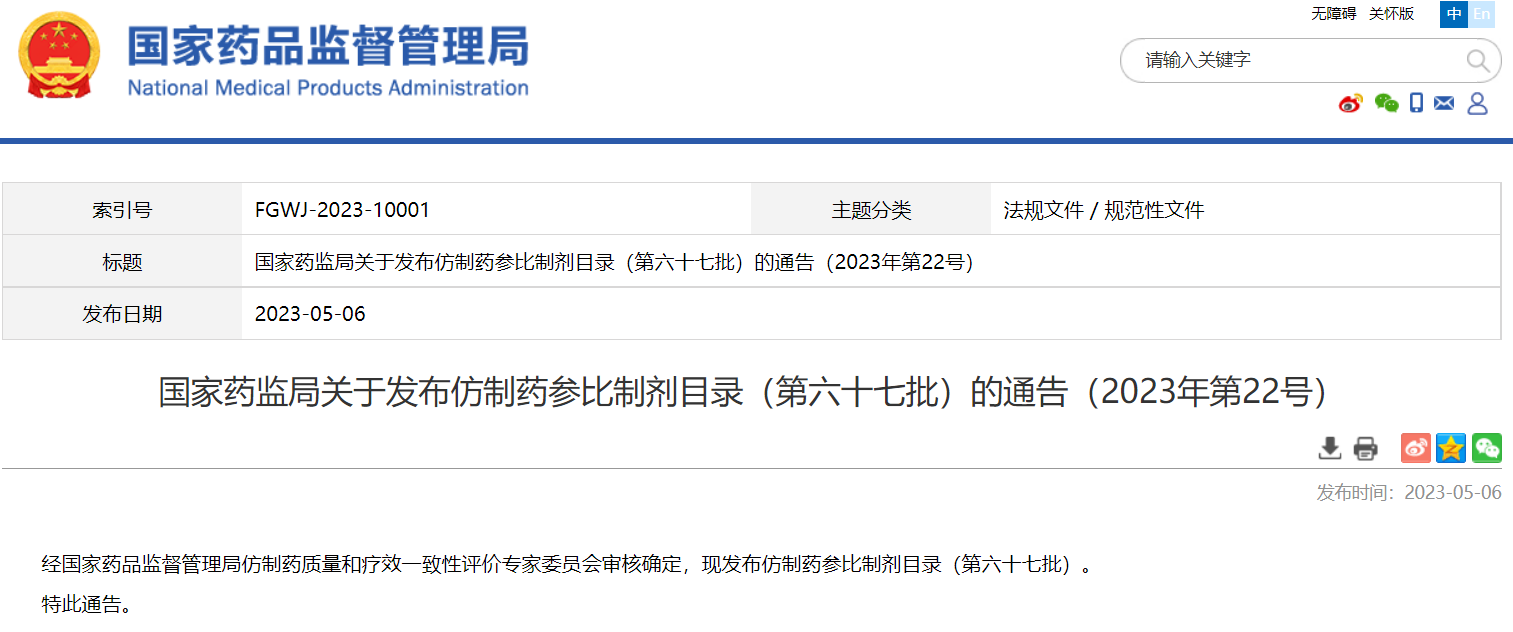 國(guó)家藥監(jiān)局關(guān)于發(fā)布仿制藥參比制劑目錄(第六十七批)的通告(2023年第22號(hào))