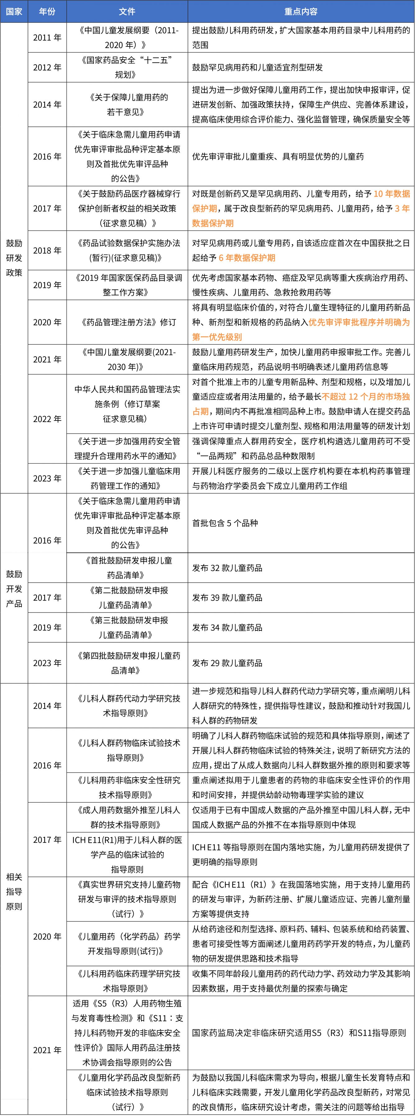 在我國,為鼓勵國內(nèi)藥企加大兒童藥的研發(fā)和生產(chǎn),近年來,政府部門陸續(xù)出臺了一系列相關(guān)政策,包括鼓勵研發(fā)、優(yōu)先評審、加強醫(yī)院配備、招標采購直接掛網(wǎng)等,部分法規(guī)詳見下表。