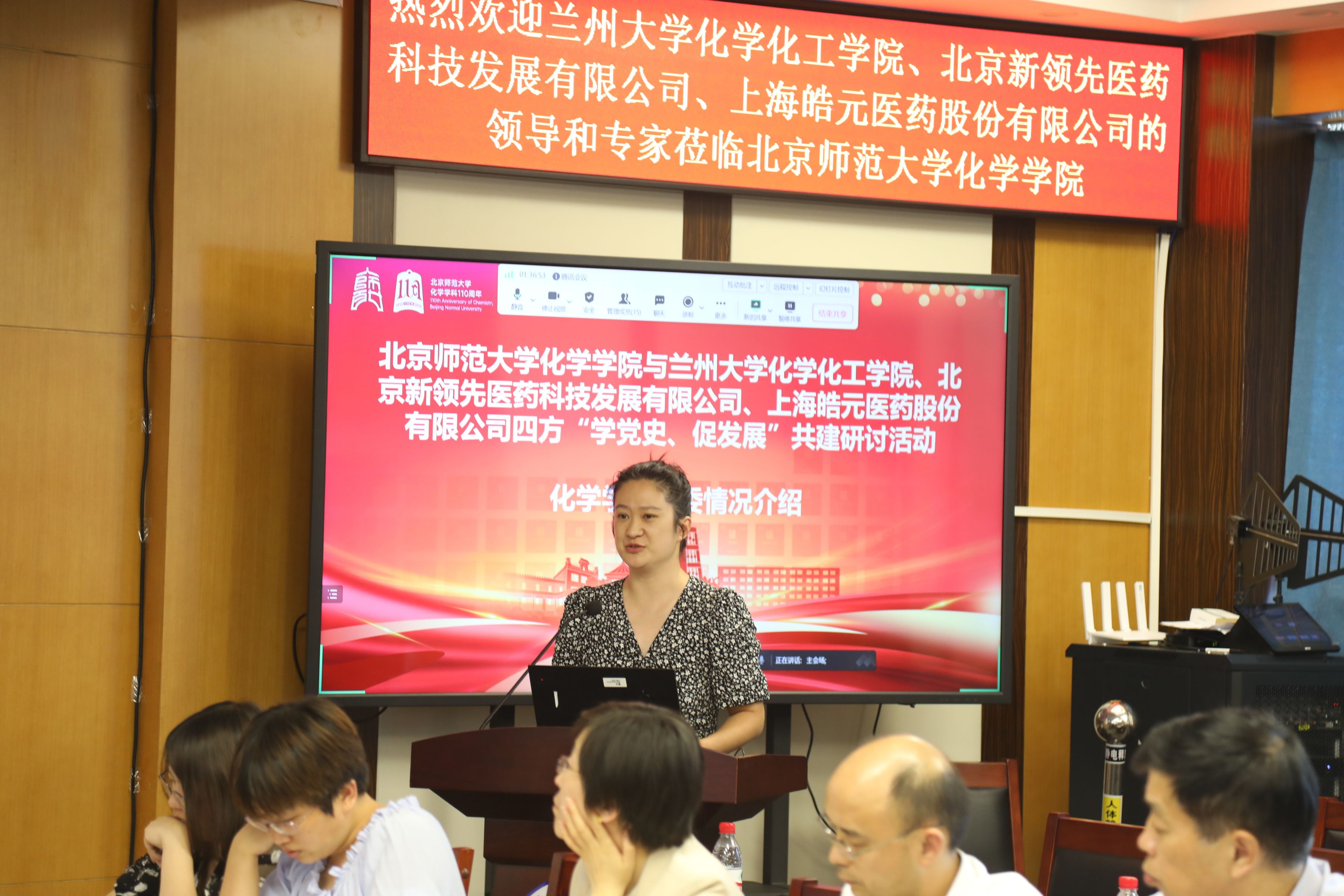 ▲ 新領先醫(yī)藥黨總支副書記、固體制劑事業(yè)部總經(jīng)理鞠平女士,蘭州大學化學化工學院丁三元教授,北師大化學學院黨委辦公室主任、團委書記徐娜女士分別作黨建工作匯報