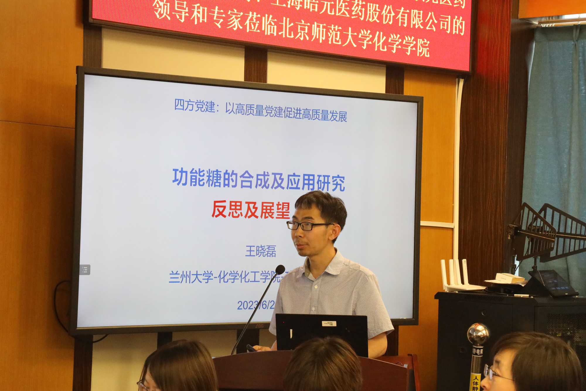 蘭州大學化學化工學院王曉磊教授、曾會應教授分別作《功能糖合成及應用研究》、《去芳香化-重新芳香化策略應用》主題分享,針對最新的研究進展與成果與在場專家領導進行分享;上海皓元醫(yī)藥產(chǎn)品負責人、樂研首席科學家陳委先生作《高??蒲谐晒诠酒脚_轉(zhuǎn)化的案例報告》分享,針對實際案例對公司科研成果轉(zhuǎn)化項目進行詳細介紹,為后續(xù)的產(chǎn)學研合作奠定基礎;北京師范大學化學學院黨委書記盧忠林教授、江迎教授分別作《藥物遞送載體的合成及性能研究》、《腦化學原位測量方法與應用基礎研究》報告分享,各方切實做到資源共享,優(yōu)勢互補。各方通過課題的深入學習和交流,組建高校-企業(yè)創(chuàng)新聯(lián)合體,通過產(chǎn)學研深度合作,推動開展關鍵核心技術(shù)、基礎前沿技術(shù)攻關,努力實現(xiàn)重點領域、關鍵環(huán)節(jié)自主可控的國家戰(zhàn)略部署。