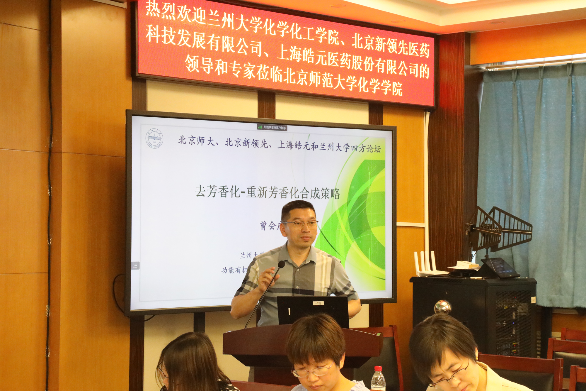 參加本次研討活動的有:北京師范大學化學學院黨委書記盧忠林教授,化學學院院長毛蘭群教授,化學學院黨委副書記韓娟博士,科研院校地合作與科研成果轉(zhuǎn)化處副處長孫根班教授;蘭州大學化學化工學院黨委書記杜生一博士,功能有機分子化學國家重點實驗室主任王為教授(線上);新領先醫(yī)藥黨總支書記、董事長陶新華先生,副總裁顏耀東先生、張翔先生,黨總支副書記、固體制劑事業(yè)部總經(jīng)理鞠平女士,黨總支紀支檢委員、臨床運營部副總監(jiān)杜書青女士;上海皓元產(chǎn)品負責人、樂研首席科學家陳委先生等30余人。