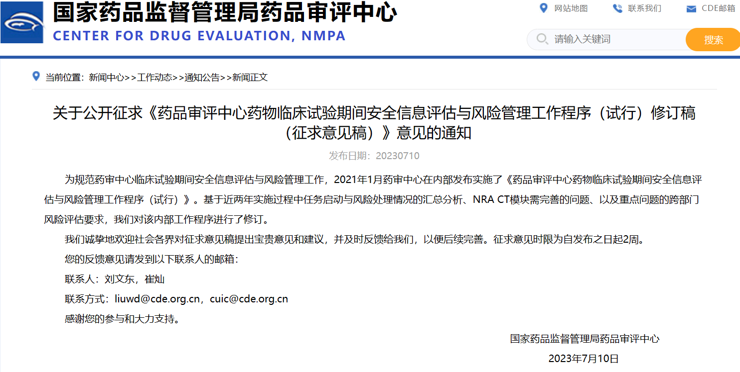 關(guān)于公開征求《藥品審評中心藥物臨床試驗期間安全信息評估與風(fēng)險管理工作程序(試行)修訂稿(征求意見稿)》意見的通知