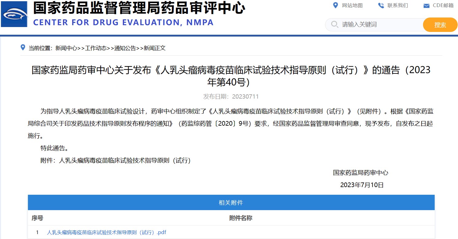 國家藥監(jiān)局藥審中心關(guān)于發(fā)布《人乳頭瘤病毒疫苗臨床試驗技術(shù)指導(dǎo)原則(試行)》的通告(2023年第40號)
