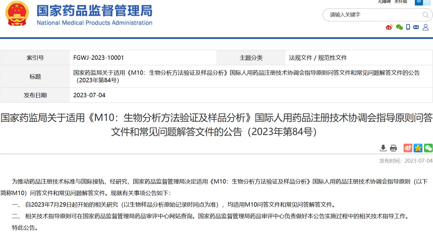 國家藥監(jiān)局關(guān)于適用《M10:生物分析方法驗證及樣品分析》國際人用藥品注冊技術(shù)協(xié)調(diào)會指導(dǎo)原則問答文件和常見問題解答文件的公告(2023年第84號)
